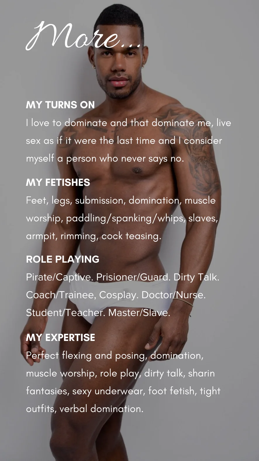 Tampar Punggung, Tarian Bogel, Menayang Badan, Fetisy Kaki, Tarian Erotik, Melentur, Melancap, Lancap Menggunakan Tangan, Goyang Jongket, Gaya Anjing, Orgasma, Penilaian Zakar, Main jari, Dildo atau Penggetar, Kulum, Duduk Atas Muka, Pertunjukan Minyak, Alat Permainan Seks, Dubur, Luar, Mandi, Arahan Lancap, SPH, Urut, Hisap Sedalam Mungkin, Penghinaan, CEI, Sembang Lucah, Alat Permainan Dubur